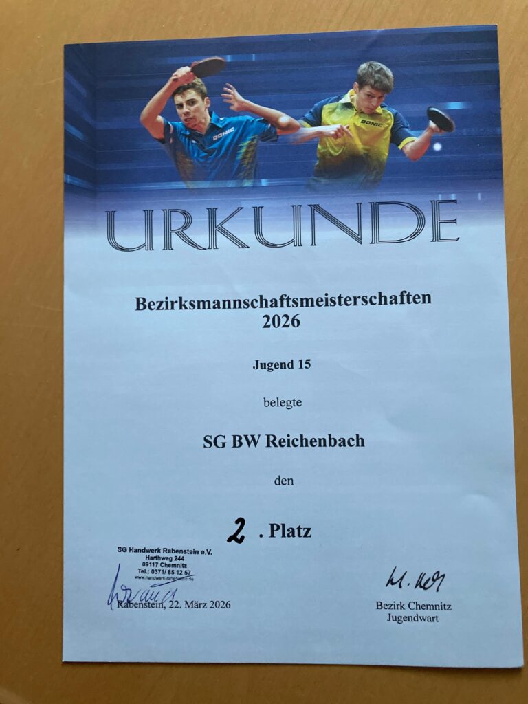 Die Jugend u15 erspielte sich bei den Bezirksmannschaftsmeisterschaften am Wochenende in Chemnitz einen starken 2. Platz. Man bezwang zwar die SG Handwerk Rabenstein klar mit 8:2, unterlag allerdings in einer sehr umkämpften Partie gegen den TTC Sachsenring Hohenstein-Ernstthal mit 5:8.